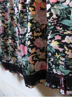 Elle est confectionnée dans un tissu noir avec des fleurs rose, verte et un peu de jaune.
