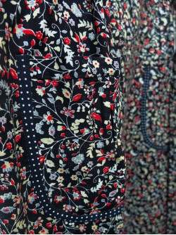 La robe est de couleur noire sur laquelle sont imprimées de petites fleurs fines rouge, grise et vertes claires.