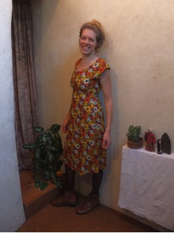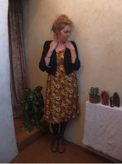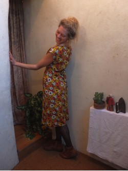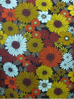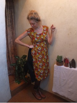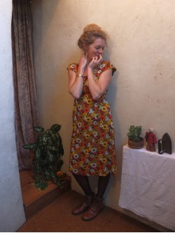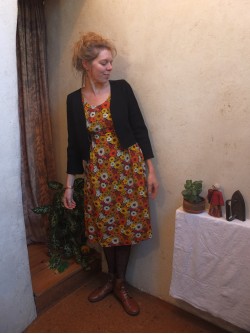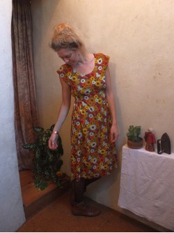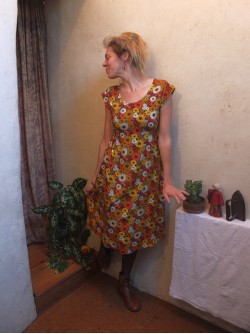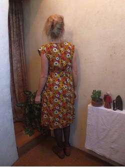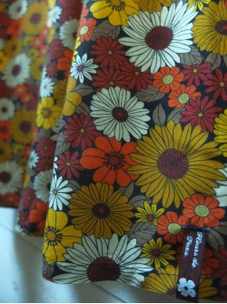La robe est confectionnée dans un tissu en viscose satiné avec des grandes fleurs vintage rouille, moutarde et écrues.